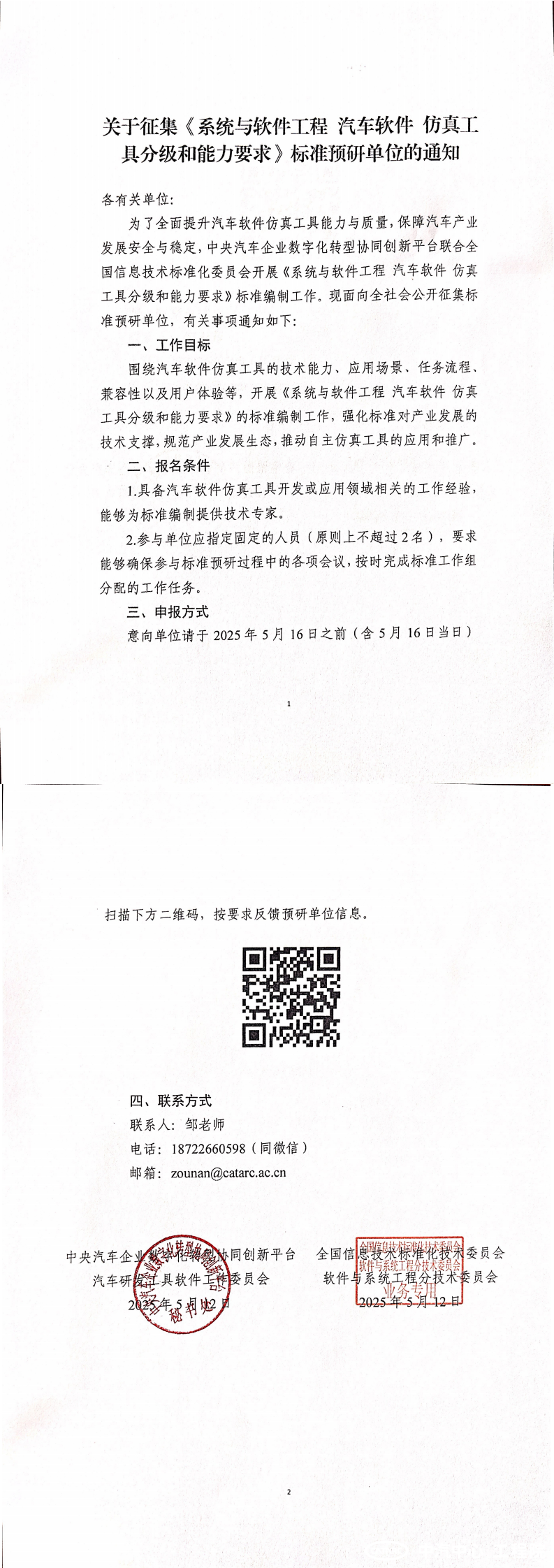關(guān)于征集《系統與軟件工程 汽車(chē)軟件 仿真工具分級和能力要求》標準預研單位的通知