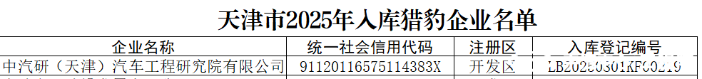 近日,天津市科技局發(fā)布“2025年天津市獵豹企業(yè)入庫名單公告”,中汽研(天津)汽車(chē)工程研究院有限公司(以下簡(jiǎn)稱(chēng)“中汽中心工程院”)憑借卓越的科技創(chuàng )新能力、高速成長(cháng)的研發(fā)實(shí)力及突出的產(chǎn)業(yè)貢獻成功入選!這是政府和社會(huì )對工程院持續深耕行業(yè)、堅持自主創(chuàng )新的高度認可,也是企業(yè)發(fā)展歷程中的又一重要里程碑。